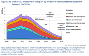 But how does this affect the global climate crisis? Across all countries transport represents a smaller proportion of total emissions – around 20%, says World in Data (and you can see its constituent parts and evolution over time to 2070 in this graph – but globally it’s electricity and power generation that is the much bigger problem; of course many deprived countries need to increase the quantity of power they can generate sustainably to meet their needs.